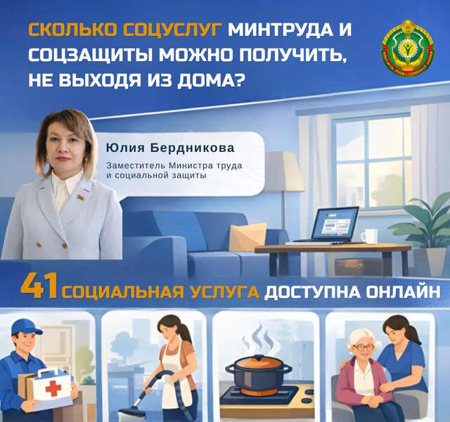 "Сегодня дистанционно можно заказать 41 вид социальных услуг", - рассказала (https://belta.by/society/view/skolko-sotsuslug-mintruda-mozhno-poluchit-ne-vyhodja-iz-doma-rasskazala-zamministra-773411-2026/) заместитель министра труда и социальной защиты Юлия Бердникова в проекте БЕЛТА "Страна говорит".