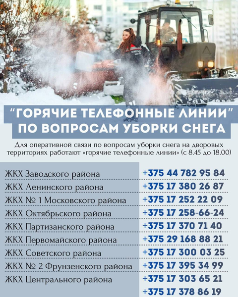 Горячие линии по вопросам уборки снега и дополнительные пункты выдачи инвентаря работают (https://t.me/mgjha/26063) в Минске.